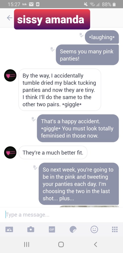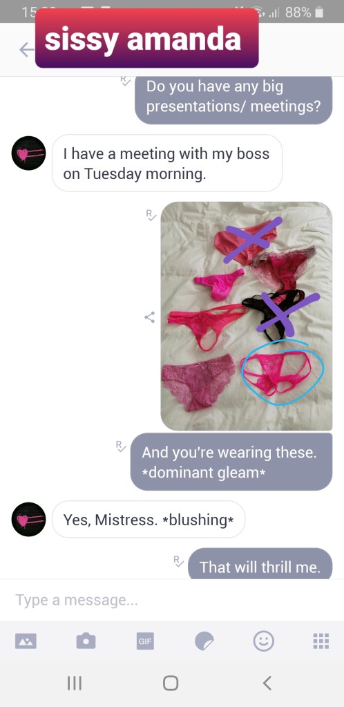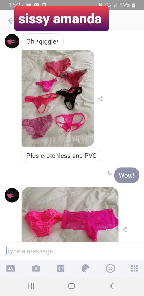 Chatting with @sissyamanda on Kik about a Victoria’s Secret panty sale on a Sunday afternoon led to a fun plan for the week ahead.