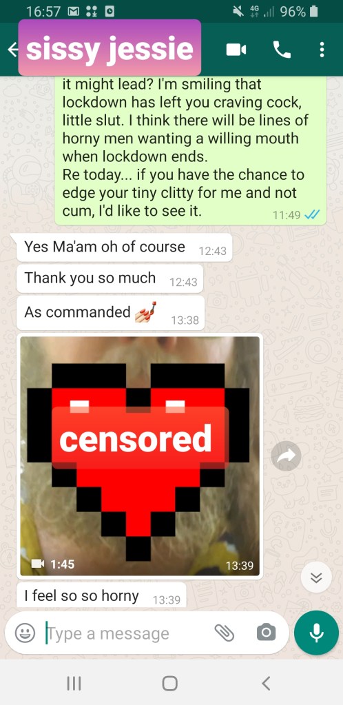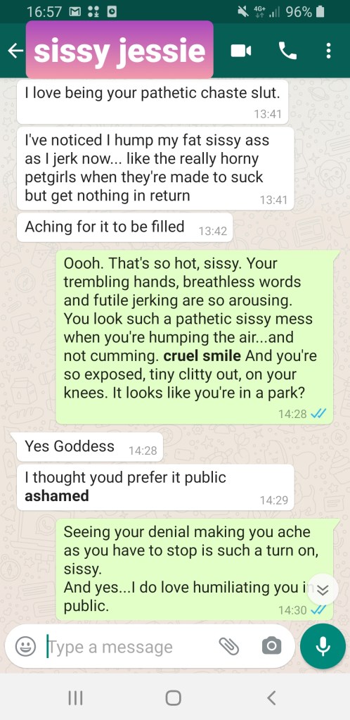 On Sunday 19 April, I was toying with jessie on Kik and this run of events unfolded. This are our Kik messages and photos from the video she sent me. This is what real-life Dominance and submission looks like.