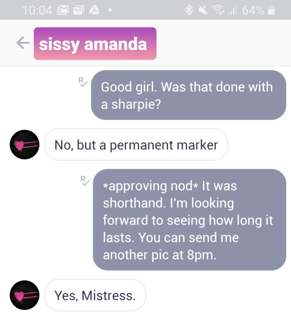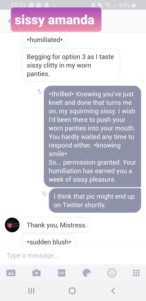 This is a typical exchange between me and @sissyamanda. I usually permit her privileges at the weekend as a reward for being an obedient, chaste girl.