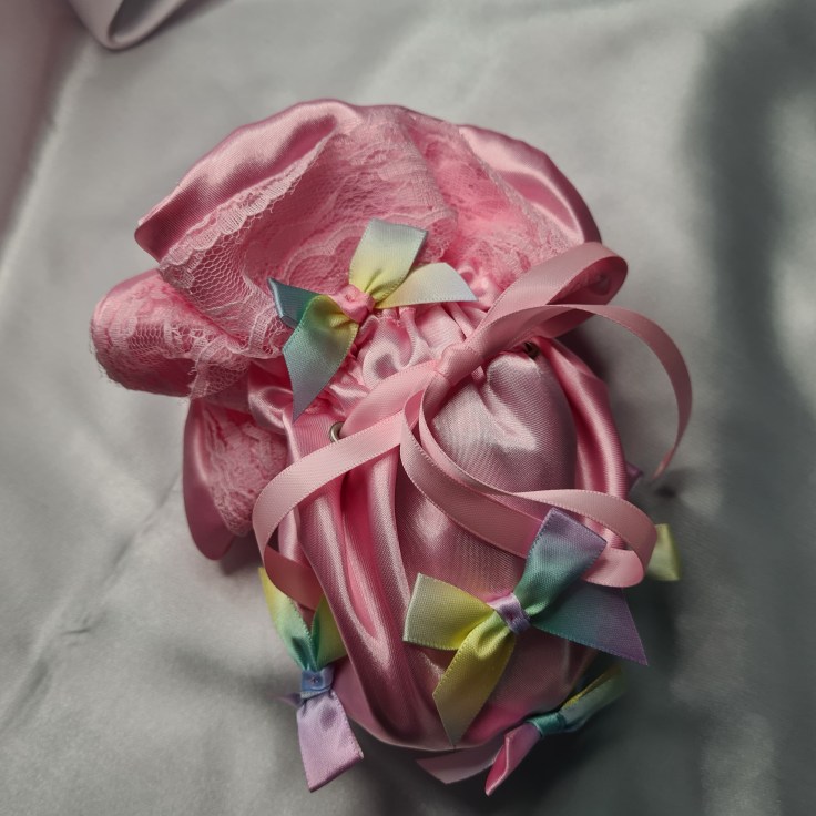 I set out to fix all this, choosing lovely satins and sewing two layers into every pouch. This also lets me create attractive colour combinations. Some are frilled in lace. Some are pure satin. Some are dainty. Some are OTT. They are all from my deviant mind. (And I have more designs planned, such as adding jingly bells.)