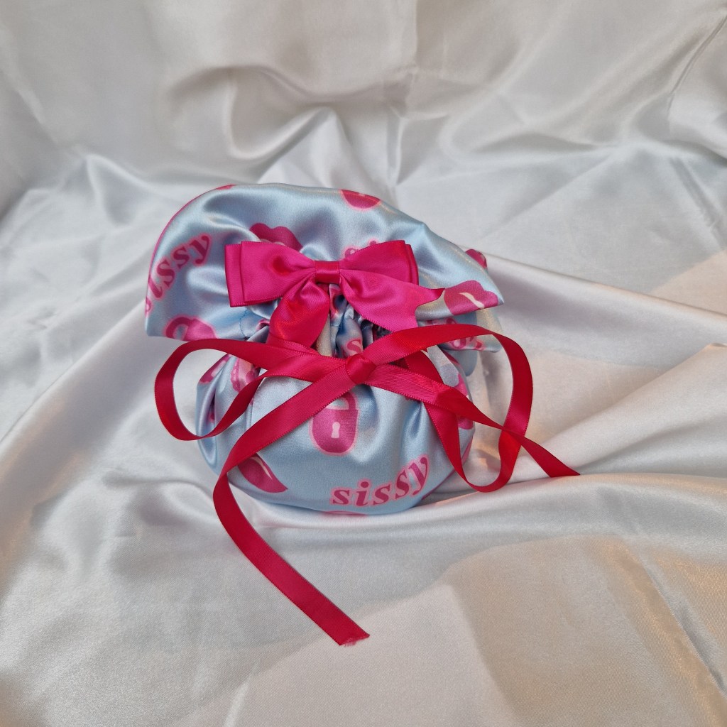 All sissies should be named for what they are, and my other two pouches literally have “sissy” written all over them. They’re also decorated with cute sissy symbols – padlocks, love hearts, panties, painted lips. Click the pics to visit my shop.