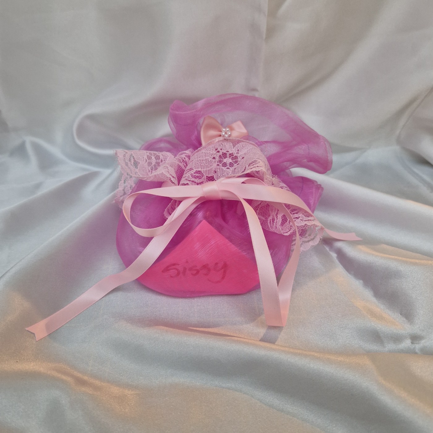 This feminising item is made from twin layers of organza. I’ve been told by the lucky sissy who got to test-drive my prototype that it’s much more noticeable to wear than a classic satin pouch. It grips a little more and makes itself known. So, if you want that gentle rub on your clitty throughout the day, this is for you.