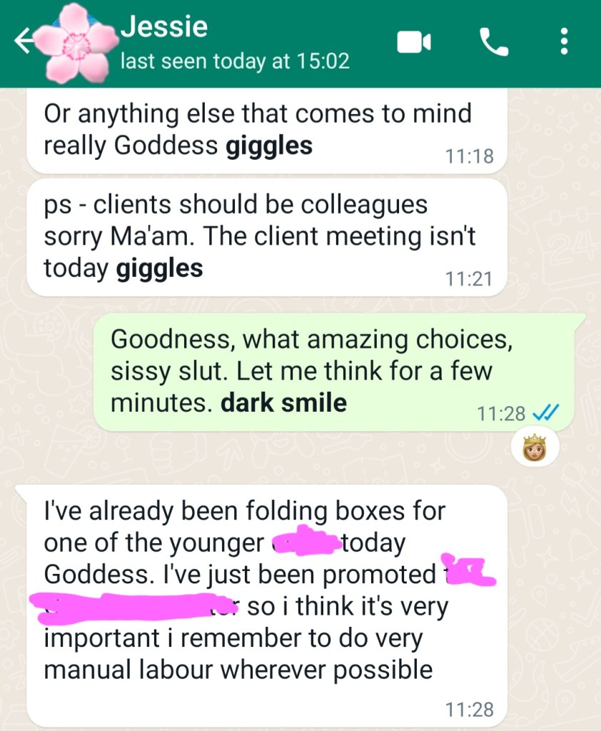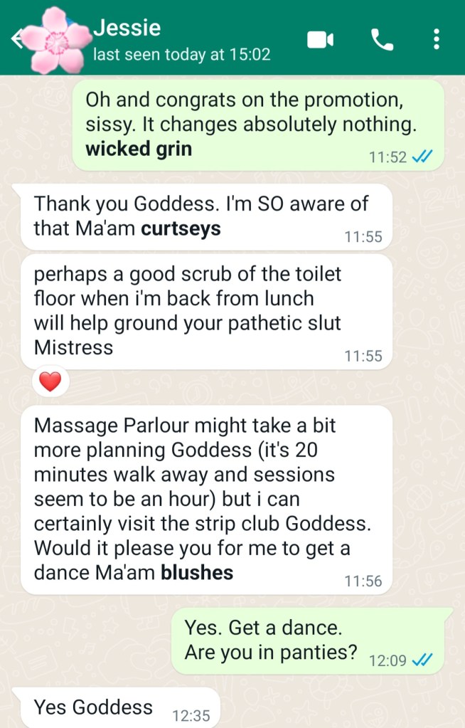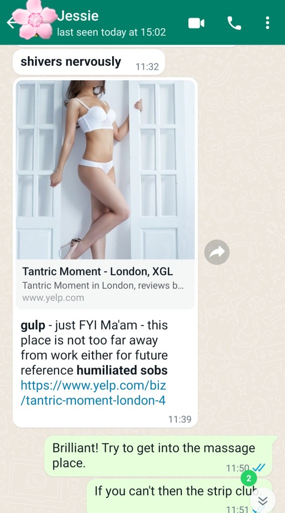 Your phones out. You type, shakily. Thank you Mistress. May I go again next week please giggles. Delete. There’s a report to write first! You head back to work to begin, but there’s a brainstorm about ‘praise kink’ sex toys.